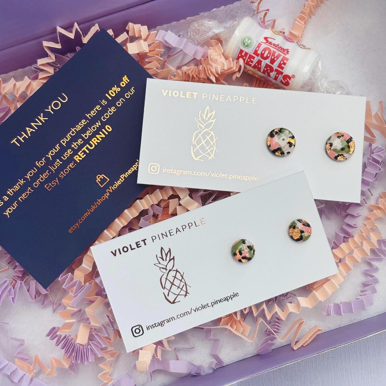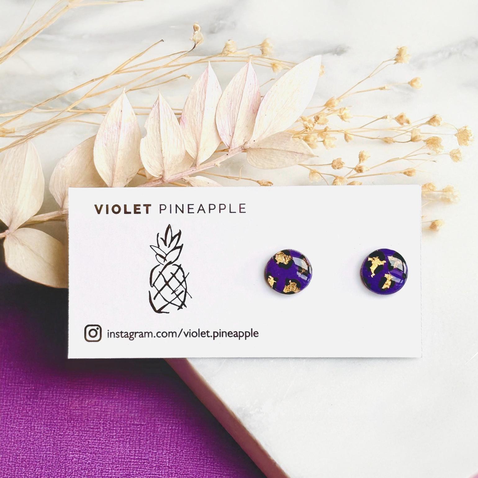 Purple Leopard Print Studs, Gold Foil Polymer Clay Jewellery, Handmade Earrings